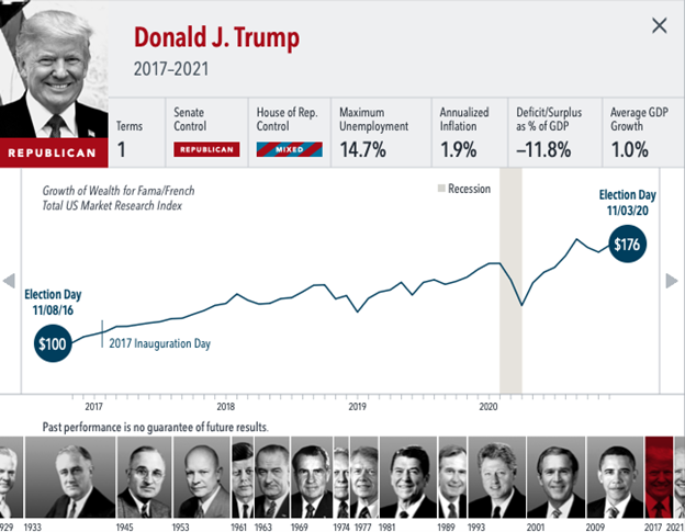For further evidence, I always like to go back to previous elections to pull data that suggest our worries may be unfounded. Election year after election year, both the red and blue claim things will be horrible if the opponent gets elected. A quick glance at the charts provided by Dimensional Fund shows that, despite the drama in the media, this hardly ever rings true. Let’s take, for example, the 2016 election when Trump was elected (Figure 2). Look how the markets performed. The same goes for Biden after that (Figure 3).