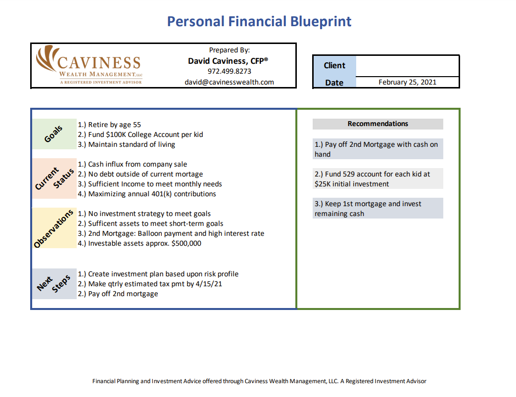 Below is a sample of Marty and Jennifer’s Personal Financial Blueprint. One of my priorities is to make financial planning and wealth management strategies as simplified as possible for my clients, so I always provide a one-page Blueprint that streamlines their most important decisions and outlines the goals those decisions will help them achieve.