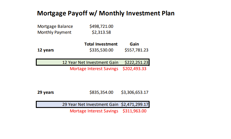 To begin, I would address their first question about whether to pay off their mortgage early or invest their cash in a brokerage account. I would help them analyze the opportunity cost of paying off the mortgage vs. investing in the markets, which you can see an example of below.